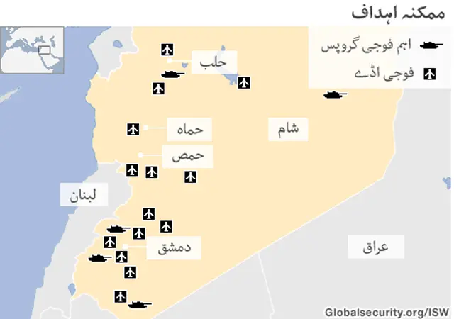 اگر شام پر حملہ ہوتا ہے تو مندرجہ ذیل نقشے میں ان ممکنہ احداف کی نشاندہی کی گئی ہے جہاں اتحادی افواج امریکی کی قیادت میں حملہ کر سکتی ہیں۔