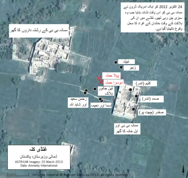 اکتوبر 2012 کو 68 سالہ خاتون ممانہ بی بی ایک دوہرے ڈرون حملے میں اس وقت ہلاک ہو گئیں جب وہ اپنے کھیتوں میں سبزیاں کاٹ رہی تھیں اور ان کے ارد گرد ان کے چند پوتے پوتیاں تھیں۔ یہ ڈرون حملہ بظاہر ایک ’ہیل فائر میزائل‘ سے کیا گیا تھا۔