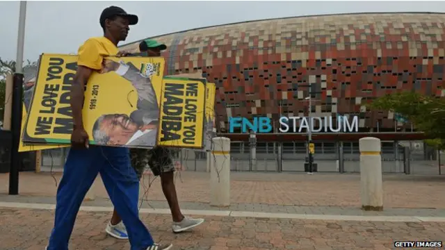 جوہانسبرگ میں موجود بی بی سی کے نامہ نگار کا کہنا ہے کہ بارش کے باوجود ہزاروں افراد نیلسن منڈیلا کے عکس والی ٹی شرٹس پہنے سٹیڈیم کے اندر جمع تھے اور وہ منڈیلا کی مدح میں اور جنوبی افریقہ میں نسل پرستی کے خلاف لڑائی کے زمانے کے گانےگا کر محوِ رقص تھے۔