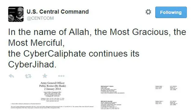 امریکی سینٹرل کمانڈ نے کہا ہے کہ وہ اس پر ’مناسب اقدامات‘ کریں گے۔ یہ ٹوئٹر اکاؤنٹ اس وقت ہیک کیا گیا ہے جب صدر براک اوباما سائبر سکیورٹی کے موضوع پر خطاب کر رہے تھے۔
