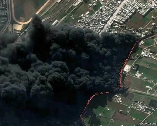 فروری 2012 کی تصاویر میں شہر کے مضافی علاقے بابا امر میں تیل کی پائپ لائن کے تباہ ہونے کے نتیجے میں دھویں کے کالے بادل دیکھے جا سکے ہیں۔ تیل کی یہ پائپ لائن شہر کے مغربی کنارے پر واقع تیل صاف کرنے والے کارخانے تک جاتی تھی۔