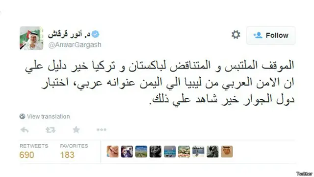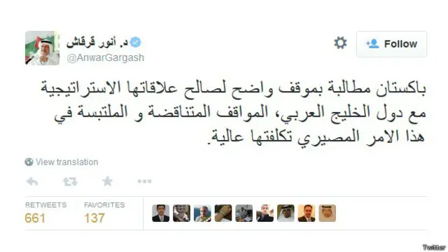 متحدہ عرب امارات کے وزیرِ خارجہ ڈاکٹر انور محمد قرقاش نے پاکستانی پارلیمان میں یمن کے تنازعے پر غیر جانبدار رہنے کی متفقہ قرار داد منظور ہونے کے بعد جمعے کی شب ٹوئٹر پر اپنے بیانات میں اس فیصلے کی مذمت کی تھی۔