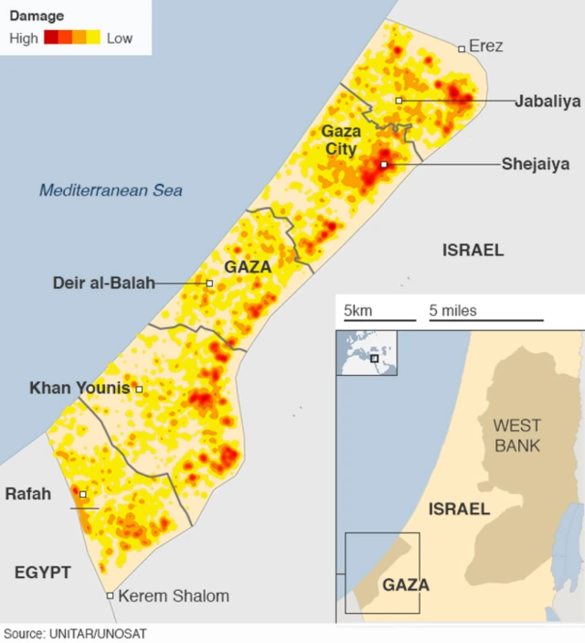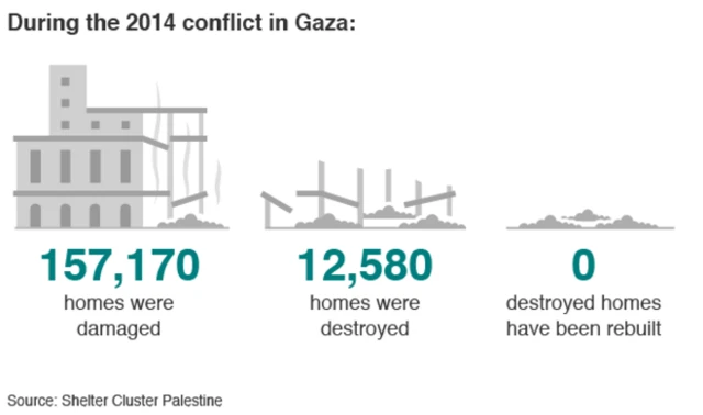 اسرائیل اور فلسطین کے درمیان 50 دن تک جاری رہنے والی لڑائی میں غزہ کی ہزاروں عمارتیں تباہ و برباد ہو گئیں اور ان میں سے ایک بھی تباہ شدہ عمارت دوبارہ تعمیر نہیں کی گئی۔