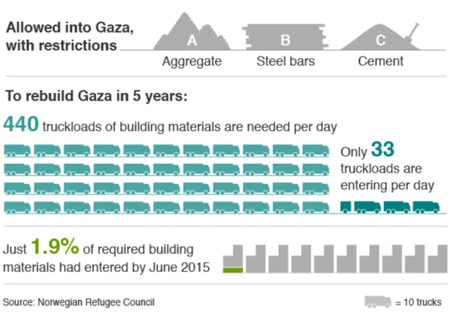 اسرائیل نے غزہ میں ’دہری استعمال‘ کے میٹریل کے داخلے پر پابندی عائد کر رکھی ہے۔ ان میں وہ عمارتی اشیا بھی شامل ہیں جنھیں استعمال کر کے شدت پسند نئی خندقیں بنا سکتے ہیں۔