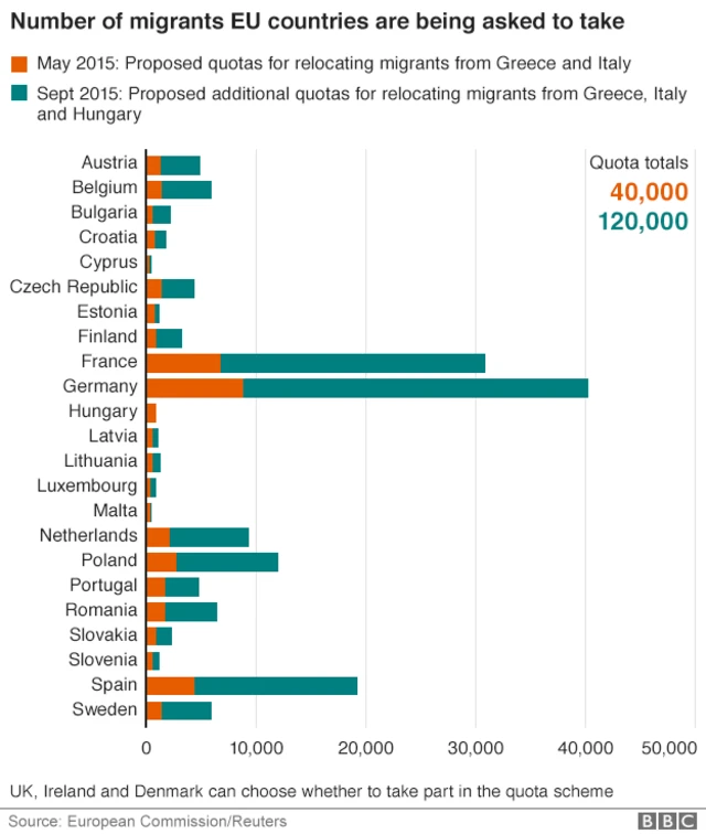 - یورپی یونین کے رکن ملک ایک لاکھ 20 ہزار اضافی پناہ گزینوں میں سے اپنے حصے کے پناہ گزین قبول کریں جو ان 40 ہزار پناہ گزینوں کے علاوہ ہوں گے جو اس سال مئی میں طے ہونے والی تعداد کے علاوہ ہیں، گو کہ اس وقت یورپی حکومتوں نے 32 ہزار پناہ گزینوں کو قبول کرنے کا ہامی بھری تھی۔
