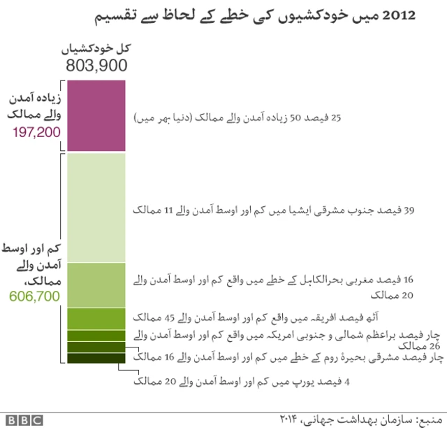 عالمی ادارہ صحت کے حالیہ اندازوں کے مطابق، جن میں 2012 سے ہونے والی اموات کا جائزہ لیا گیا تھا، یہ بات ثابت ہوتی ہے کہ خودکشی ایک عالمی مسئلہ بن چکی ہے۔