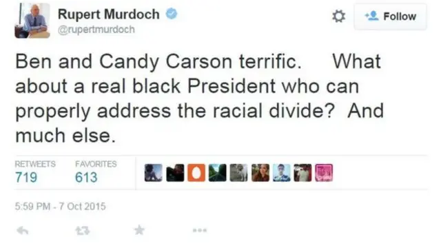 رپبلکن پارٹی کے امیدوار بین کارسن کی تعریف کرتے ہوئے انھوں نے لکھا تھا کہ ’بین اور کینڈی کارسن لاجواب ہیں۔ کیا ایک اصل سیاہ فام صدر نہیں ہونا چاہیے جو مناسب طریقے سے نسلی تقسیم کا معاملہ حل کر سکے؟‘