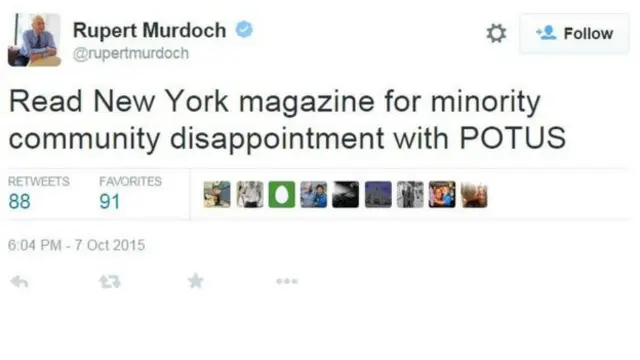 روپرٹ مرڈوک نے نیویارک سے نکلنے والے ایک رسالے میں شائع ہونے والے ایک مضمون کو بھی سراہا جس میں اوباما سے ’اقلیتی برادری کی مایوسی‘ کا ذکر کیا گیا تھا۔