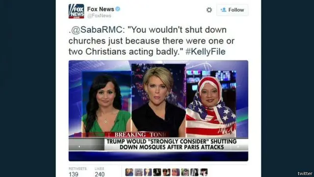ٹی وی پروگرام کے دوران اُن کے ساتھ ڈانلڈ ٹرمپ بھی موجود تھے، جن کا کہنا ہے کہ دہشت گردی کو روکنے کے لیے امریکہ میں مساجد کو بند کر دینا چاہیے۔