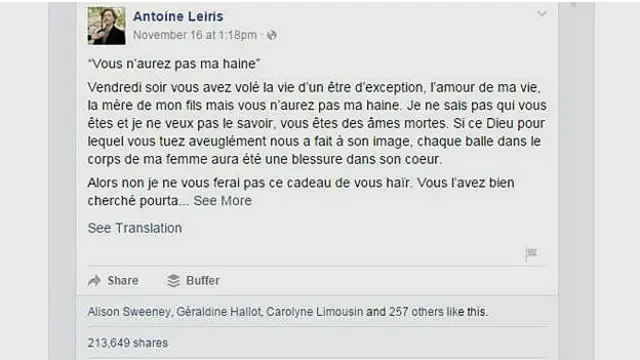 ’جمعے کو تم ( دولتِ اسلامیہ کے شدت پسندوں) نے ایک غیر معمولی شخص کی زندگی چھین لی۔ جو میری زندگی کا پیار تھا، میرے بیٹے کی ماں تھی، لیکن میں تم سے نفرت نہیں کروں گا۔‘