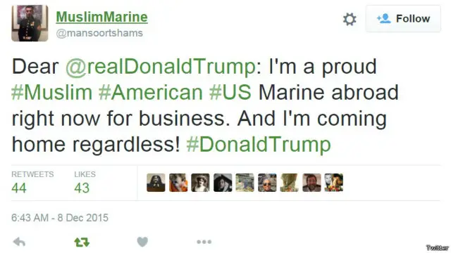 ڈونلڈ ٹرمپ کو اس سے قبل جواب دینے والے ایک مسلمان میرین رفیق کا جواب انٹرنیٹ پر بہت وائرل ہوا تھا۔ انھوں نے ڈونلڈ ٹرمپ کو مخاطب کرتے ہوئے لکھا: ’ڈیئر ڈونلڈ ٹرمپ میں ایک مسلمان امریکی میرین ہوں جو کام کے سلسلے میں ملک سے باہر ہوں۔ میں جو مرضی ہو واپس آ رہا ہوں۔‘