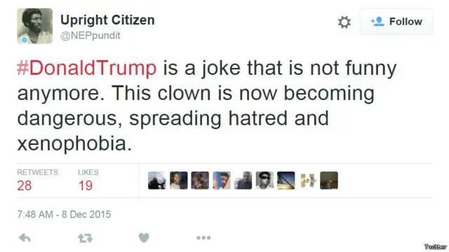 جبکہ ایک اور ٹوئٹر صارف اپ رائٹ سٹیزن نے لکھا: ’ڈونلڈ ٹرمپ ایک ایسا مذاق ہے جو اب مزاحیہ نہیں رہا۔ یہ مسخرہ اب خطرناک ہو رہا ہے جو اب غیرملکیوں سے نفرت پھیلا رہا ہے۔‘