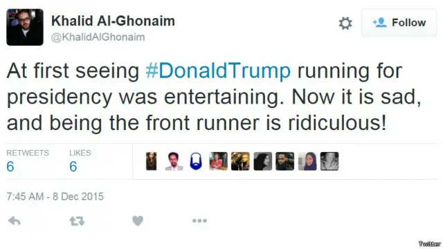 خالد غونیم نے لکھا: ’پہلے لگتا تھا کہ رپبلکن پارٹی کے صفِ اول کے رہنما کی باتیں دلچسپ ہوتی تھیں مگر اب دکھ ہوتا ہے، وہ بہت ہی بے ڈھنگی باتیں کر رہے ہیں۔‘