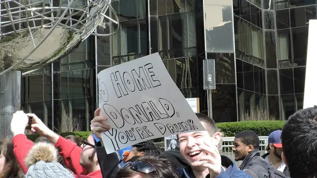 50 کے قریب مظاہرین نے سڑک مسدود کر کے ٹریفک میں خلل ڈالا۔ انھوں نے ہاتھوں میں پوسٹر اٹھا رکھے تھے جن پر درج تھا: Dump Trump
