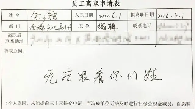 یو شلوئی نامی صحافی نے، جو سدرن میٹروپولس ڈیلی کے کلچرل ایڈیٹر تھے، اپنے استعفے میں لکھا کہ وہ مزید حکمران کیمونسٹ پارٹی کی لائن کی پیروی نہیں کر سکتے۔ انھوں نے اپنے استعفے کی نقل بھی اپنے بلاگ میں لگائی لیکن اسے کچھ دیر بعد ہی ہٹا دیاگیا۔