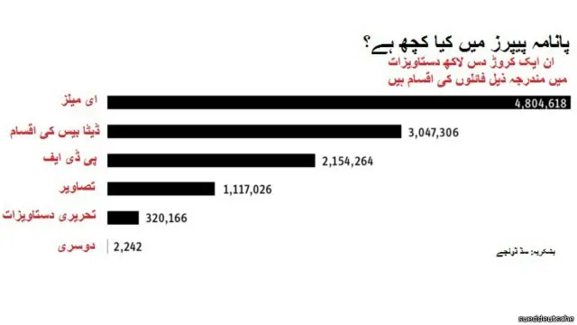 پاناما پیپرز کے ڈیٹا کے حجم کا اندازہ اس بات سے لگائیں کہ یہ وکی لیکس کی سفارتی کیبلز، آف شور لیکس، لکس لیکس، سوئس لیکس کے سارے ڈیٹا سے زیادہ ہے جس میں ای میلز، پی ڈی ایف فائلیں، تصاویر اور موساک فونسیکا کے اندرونی ڈیٹا بیس کا حصہ بھی شامل ہے جو 1970 سے 2016 تک پھیلا ہوا ہے۔