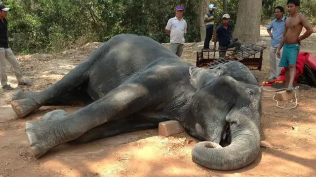 ایک ہتھنی ’انگکور واٹ‘ کے مشہور مندروں تک سیاحوں کو لاتی لیجاتی تھی۔ مادہ ہاتھی 40 ڈگری سینٹی گریڈ کی گرمی میں کام کرنے کے دوران مرگئی۔