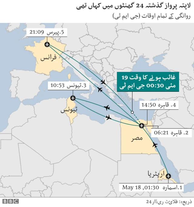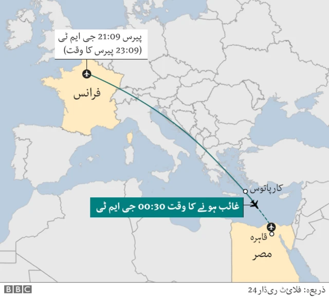 مصری حکام کا کہنا ہے کہ وہ آخری بار طیارے کے ریڈار پر دکھائی دیے جانے والے علاقے میں تلاش کے لیے جیٹ طیارے بھیجے گئے ہیں۔ اس کے علاوہ یونان کے حکام سے بھی اس حوالے سے رابطہ کیا گیا ہے۔