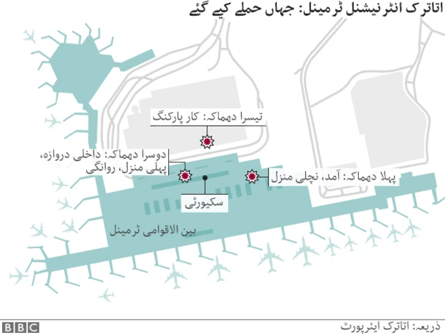 استنبول کے گورنر نے صحافیوں کو بتایا:’ تین خودکش حملہ آوروں نے یہ حملہ کیا۔‘