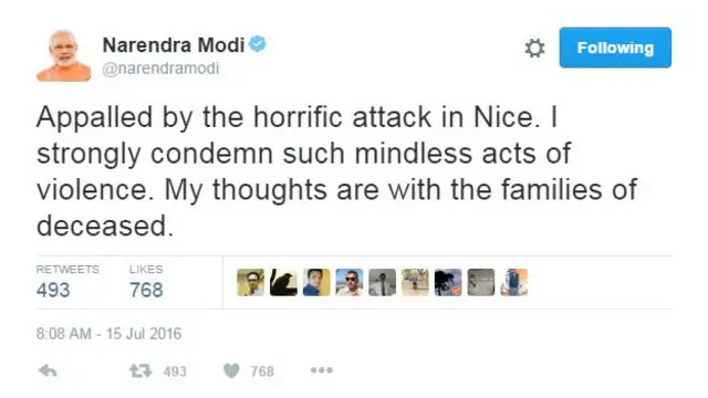 انھوں نے اپنے ایک ٹویٹ میں کہا کہ یورپ اور ایشیا کے رہنما نیس کے متاثرین کو خراج تحسین پیش کرتے ہیں۔ ’ہم تشدد اور نفرت کے خلاف متحد ہیں۔‘