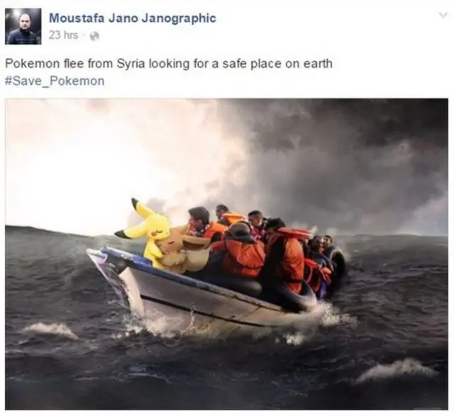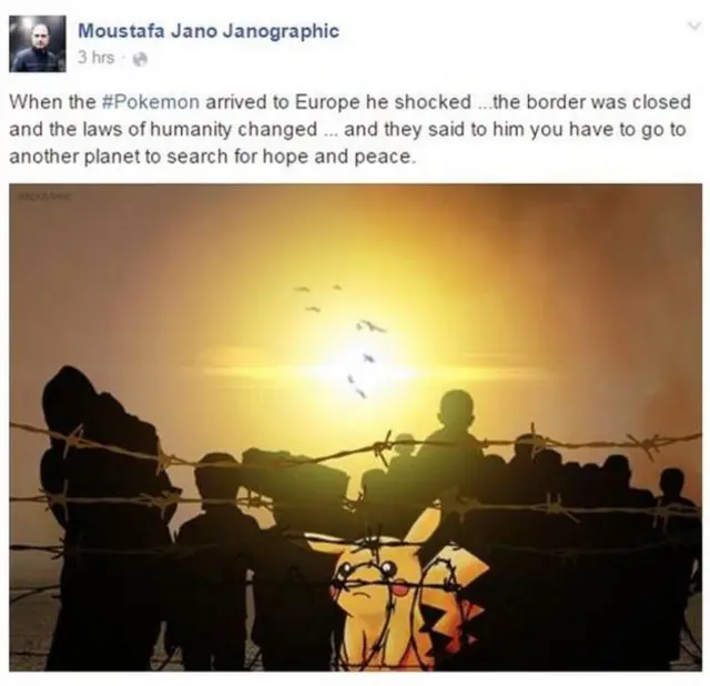 مصطفیٰ جانو ایک شامی ہیں جو سویڈن میں رہائش پذیر ہیں۔ انھوں نے فیس بک پر کئی پوسٹیں کی ہیں جن میں پوکے مون اس سفر پر ہے جو سفر پناہ گزینوں نے اختیار کیا تمام تر خطرات کے باوجود۔ ایک پوسٹ میں جانو نے سویڈن کے ایک ناول نگار کی تحریر کچھ اس طرح لکھی ہے ’دادا جان آپ نے 2016 کے موسم گرما میں جب دنیا میں آگ لگی ہوئی تھی کیا کیا؟ او میرے بچو، ہم فون پر پوکے مون کے کرداروں کو ڈھونڈ رہے تھے۔‘