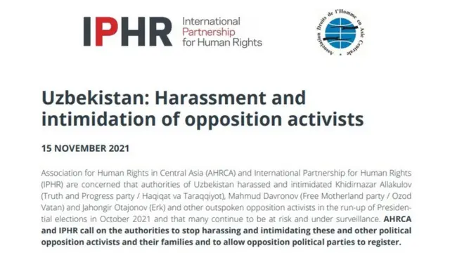 IPHR баёнотида айтилишича, Ўзбекистон расмийлари Хидирназар Оллоқулов, Маҳмуд Давронов, Жаҳонгир Отажонов ва бошқа фаол мухолифат аъзоларини 2021 йилги президентлик сайловлари олдидан қўрқитган ва тазйиқ остига олган.