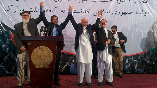 جمهور رئیس لیک سیلاو نامزد لری عبدالله عبدالله و اشرف غنی احمدزی لر آیلرچه دوام ایتگن سیلاو بحرانی آرتیدن افغانستانده خلق آرا هم جمعیت دولتلری، بیرلشگن مللت لر تشکیلاتی و افغانستان حکومتی نینگ اره لشو بیلن ملی بیردملیک حکومت نینگ قوریشینی قبول قیلگنلر.