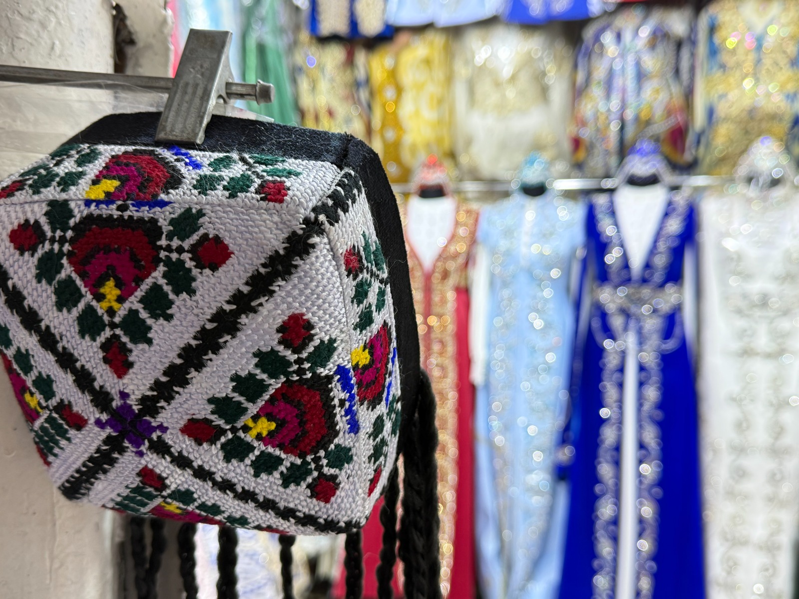 "Atlas va adraslarni Marg‘ilondan olib kelaman. Kelinlar uchun tikilgan bu kiyimlarni, esa Toshkentdan "zakaz" qilamiz. Do‘ppilar ham O‘zbekistondan kelgan. Ancha yildan beri tirikchiligimiz shundan" - qirg‘izistonlik sotuvchi Mo‘’tabar opa.