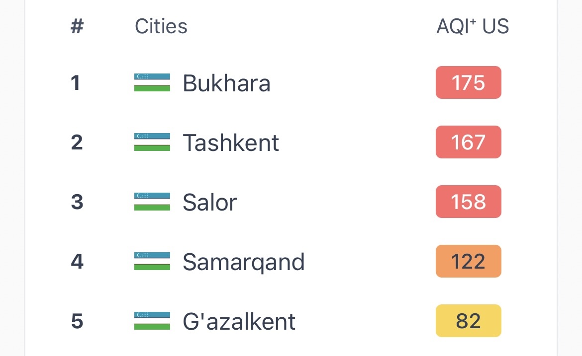 Охирги кунларда пойтахт Тошкентдан ташқари Самарқанд, Бухоро ва яна қатор шаҳарларида ҳаво сифати инсон учун хавфли даражага чиққани ҳақида IQAir каби кузатув ташкилотлари кўрсатгичлари далолат бермоқда.