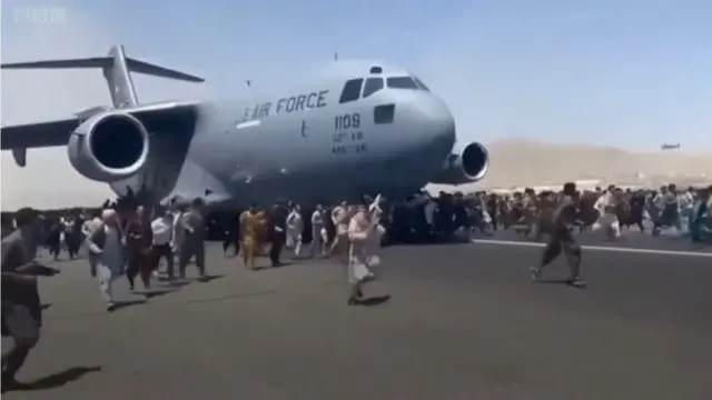 Аэропортнинг учиш йўлагида парвозга отланган АҚШ ҳарбий самолётига осилиб олган ва учоқ атрофида югуриб бораётган одамларнинг видеоси Твиттерда тарқалди