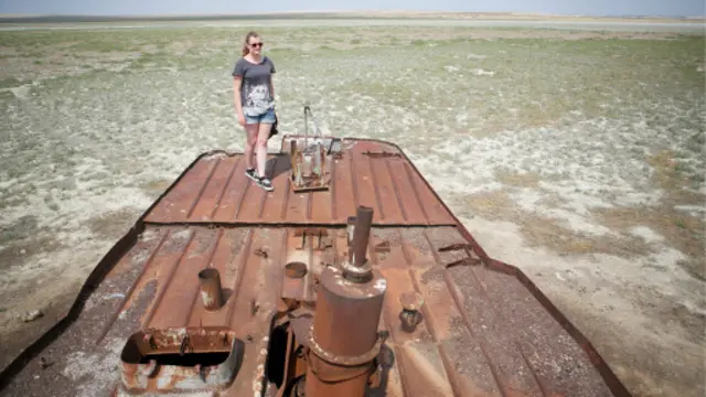 Биз эса, соҳилбўйидаги йирик қум деворлари, бир пайтлардаги миллионлаб балиқлар ўрнини эгаллаган туялар ҳамда чанг-тўзон қоплаган кемалар қолдиқларига тикиламиз. Ҳалокат ҳудудига саёҳатимиздан ўнғайсизланамиз. Аммо, гидимиз имкон қадар бунга ўрин қолдирмасликка уринади: