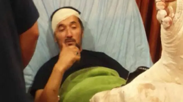 Бу суратда собиқ Тожик ОМОН подполковниги боши боғланган, ўнг оёғи гипсланганини кўриш мумкин.