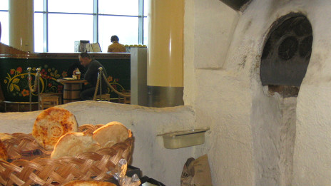 Домодедово ҳаво қўналғаси иккинчи қаватидаги "Узбечка" ресторанида кўмирда нон ёпиб, дошқозонда палов дамлашади