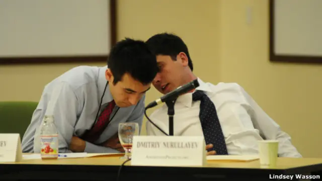 Дмитрий Нуруллаев: Мен бу саволга шундай мисол билан жавоб бермоқчиман: Ўзбекистонда сартарошга борсангиз, ва унга "сиз нима учун соч оласиз, ўқитувчилик қилсангиз бўлмайдими", "агар ўқитувчи бўлиб ишлаганингизда жамиятга кўпроқ ўзгартириш киритардингиз ёки яхшироқ бўларди", деб айтсангиз, сартарош ҳам ҳайрон қолади. Ўқитувчилик ҳам керакли касб, сартарошлик ҳам керакли касб. Мен мана шундай жавоб бермоқчиман. Ҳа, тўғри. У киши айтаётган лойиҳалар жуда ҳам қизиқ ва жуда ҳам керакли. Лекин бизнинг бюджетимиз жуда ҳам кам. Ва боя айтганимдек, бизнинг ўзимизнинг бошқа ишларимиз ҳам бор. Мисол учун Азиз инженер бўлиб ишлайди. Руслан мактабда ўқийди. Мен эса нодавлат ташкилотда ишлайман. Ҳаммамизда бошқа-бошқа ишларимиз бор. Шунинг учун биз қанақадир битта лойиҳа танлаб, ўша лойиҳага бор бюджетимизни ва ҳамма энергиямизни қаратмоқчи эдик. Бошқа ҳамма ташкилотлар каби биз ҳам танлашимиз керак, нимага эътибор қаратамиз, қайси нарсага эътибор қаратмаслигимизни. Бундан ташқари, биз АҚШда бир-икки конференция ташкил қилдик. Ва ҳозирги вақтда биз ўзимизнинг мақсадимизни ўзгартираяпмиз. Чунки Ўзбекистонга қайта олмаганимиз учун биз ҳозир Ўзбекистонда лойиҳа қилишнинг ўрнига ўзимиз учун бошқа миссия топишимиз керак эди. Биз ўзимиз учун топган миссиямиз АҚШда интеллектуал давралар орасида конференциялар ўтказиб, нафақат Ўзбекистон, балки бутун Ўрта Осиёдаги вазиятни ҳаммага кўрсатиб, ана шу вазият ҳақида информация беришни ўз олдимизга мақсад қилиб олдик. Агар биз активист бўлиб, инсон ҳуқуқлари ҳақида, Ўзбекистондаги инсон ҳуқуқларининг бузилиши ҳақида информация берган бўлсак, ҳозир кўпроқ аналитика тарафидан информация бераяпмиз. Яъни, ҳозир бизнинг мавқеимиз активист эмас, нейтрал тарафдан. Ҳам Ўзбекистон, ҳам бошқа мамлакатларнинг фикрларини ўрганиб, биз ҳар хил экспертлар, академикларни бир даврага чорлаб, анжуман ўтказиш - бу бизнинг янги мақсадимиз.