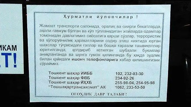 O‘zbekiston transport vositalari, xususan metroda yangi e‘lonlar paydo bo‘lgan va unda ogohlikka da‘vat qilinadi.
