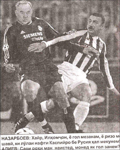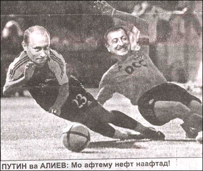 Назарбоев: Хўп, Илҳомжон, ё гол ураман ёки Каспий қувури масаласини Россиясиз ҳал қилишимизга рози бўласан! Алиев: Йўлимни тўсманг, ака! Қўйинг бир гол урайлик!