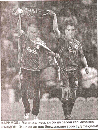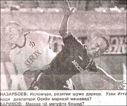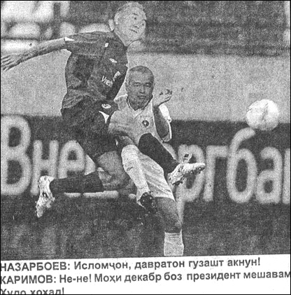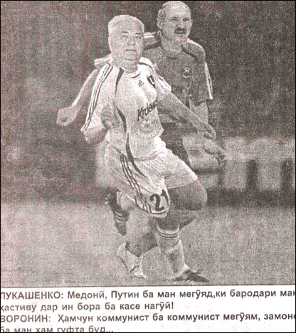 Тожикистондаги "Нигоҳ" мустақил ҳафтаномаси ўзининг бир неча нашрида МДҲ давлатлари президентларини футболчиларга ўхшатиб, ҳажвий суратларни нашр этган. Коллажларда ҳамдўстлик давлатлари ўртасидаги келишмовчиликлар акс эттирилган