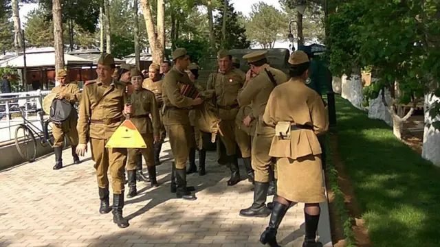 Совет ҳарбийларининг кийимларини кийиб олган ёшларнинг тўп-тўп бўлиб юргани ҳам акс этган.