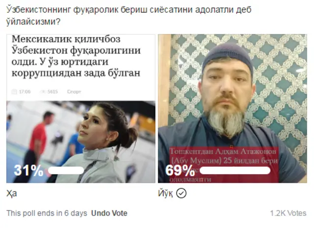 "Мексикалик қиличбоз Ўзбекистон фуқаролигини олди. У ўз юртидаги коррупциядан зада бўлган. Тошкентдан Адҳам Атажонов(Абу Муслим) 25 йилдан бери Ўзбекистон фуқаролигини ололмаяпти. Ўзбекистоннинг фуқаролик бериш сиёсатини адолатли деб ҳисоблайсизми?" деган савол билан муштарийларимизга мурожаат қилган эдик.