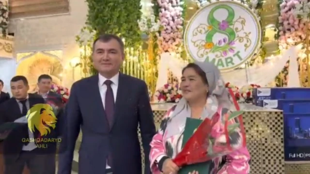 Қашқадарё вилояти ҳокимлиги улашган яна ана шундай тадбирдан олинган видеода вилоят ҳокими Муротжон Азимов меҳмон аёллардан бирини табриклаётгани кўринади.