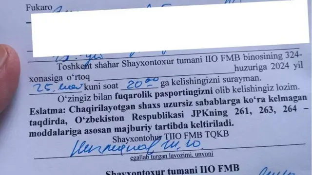 BBC suhbatlashgan kamida uch kishi oxirgi kunlarda Ichki ishlarning anti-terror bo'linmalariga chaqirtirilganliklarini ma'lum qilishdi. Ular - Rossiya Prezidenti Vladimir Putinning O'zbekistonda davlat tashrifi arafasida unga qarshi ijtimoy tarmoqlarda salbiy ruhda sharhlar yozganlar.