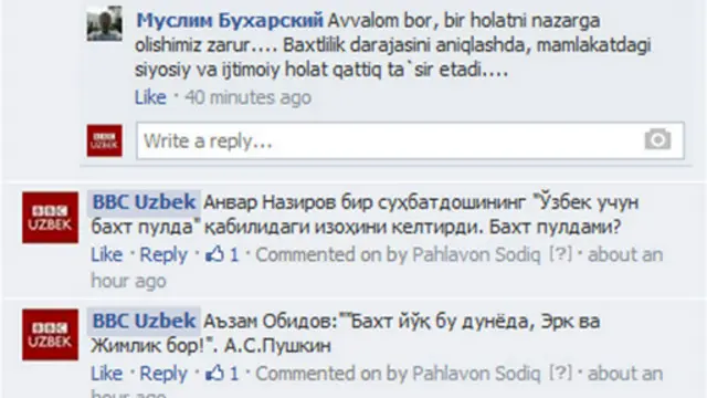 BBC Uzbek: Бахт анчайин индивидуал тушунча бўлгани учун бутун-бошли халқларнинг ўзларини қанчалик ва қандай ҳолатларда бахтли ҳис қилишлари ҳақида гапириш-жуда нисбий. Аммо барибир ижтимоий маънодаги бахт мавжуд. Бизга, масалан, Ўзбекларнинг бахтни нима билан ўлчашлари қизиқ. Халқимиз тинчлик, осойишталикни қадрлашини биламиз, яна нималар?. Фикрларингиз, марҳамат...