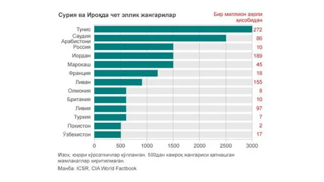 "Исломий Давлат" сафидаги "500 нафар жангариси" билан Ўзбекистон энг қуйи ўринда келган.