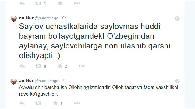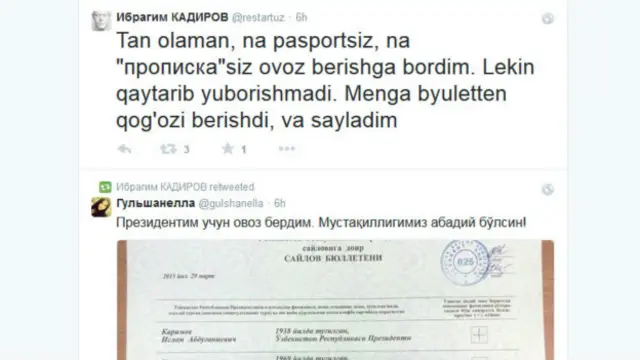 Мана бу эса "Иброҳим Қодиров" номли фойдаланувчининг Тwиттердаги фикри: "Тан оламан - на паспортсиз, на пропискасиз овоз беришга бордим. Лекин қайтариб юборишмади. Менга бюллеттен қоғози беришди, ва сайладим".