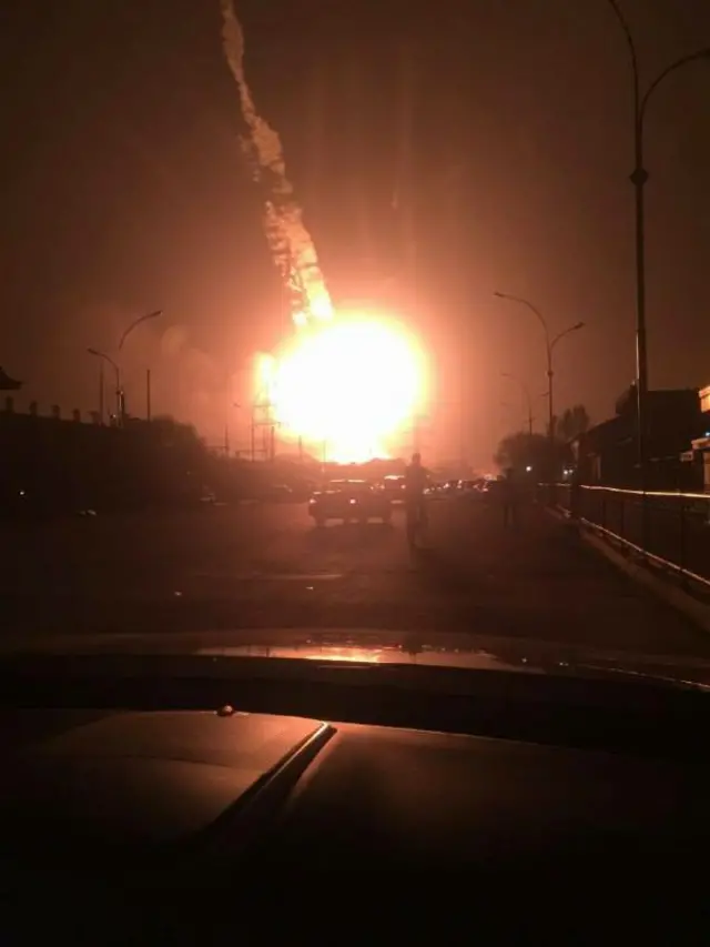 Сўнг кучли портлаш рўй бергани ва аланга 20 метрча юқорига кўтарилгани акс этган.