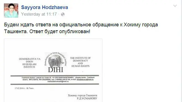 Сайёра Хўжаева ўз Фейсбук саҳифасида мазкур мактуб нусхасини чоп қилар экан, "Тошкент шаҳри ҳокимига йўлланган расмий мурожаатномага жавоб кутиб қоламиз. Жавоб чоп этилади!" деб ёзди.
