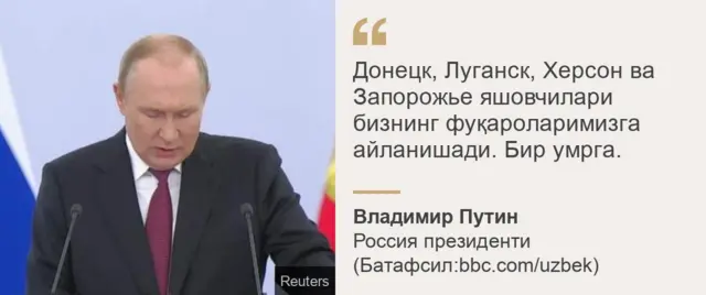 Президент Путин ҳали тўлиқ босиб олмаган эсалар-да, Украинанинг тўрт минтақасини ўзлариники, аҳолисини Россия фуқаролари, деб эълон қилди.
