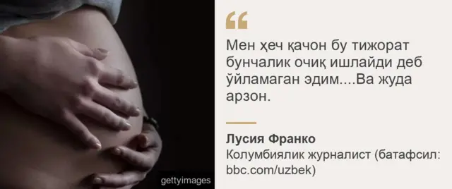 Бу баҳсли тижоратни тадқиқ қилаётган колумбиялик журналист Лусия Франко бачадон ижарачилари ва мижозларни топиш қанчалик осон эканлигидан шокка тушди.