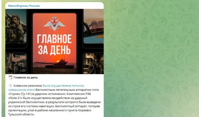 "Тула вилоятига жойлаштирилган Россия ҳаво мудофааси тизимлари - С300 ва Панцирь-С1 аксил-учоқ ракета тизимлари ва Поле-21 электроник уруш тизимлари ишончли ҳимоя билан таъминлайди", дейилади вазирлик хабарида.