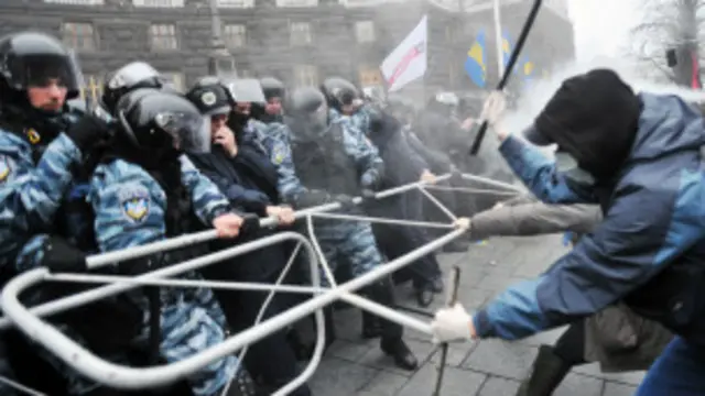 "Маъмурий биноларни қўриқлаш учун милиция занжири ташкил қилинган эди. Айрим фуқаролар ана шу занжирни ёриб ўтишга ҳаракат қилишди ва милиция тарафга тутун бомбаларини улоқтиришди. Бир-икки марта газ ҳам сепишди. Ҳужумни қайтариш мақсадида милиция кўздан ёш оқизадиган газ қўллашга мажбур бўлди", деб айтган Киев Ички ишлар бошқармаси матбуот хизмати.